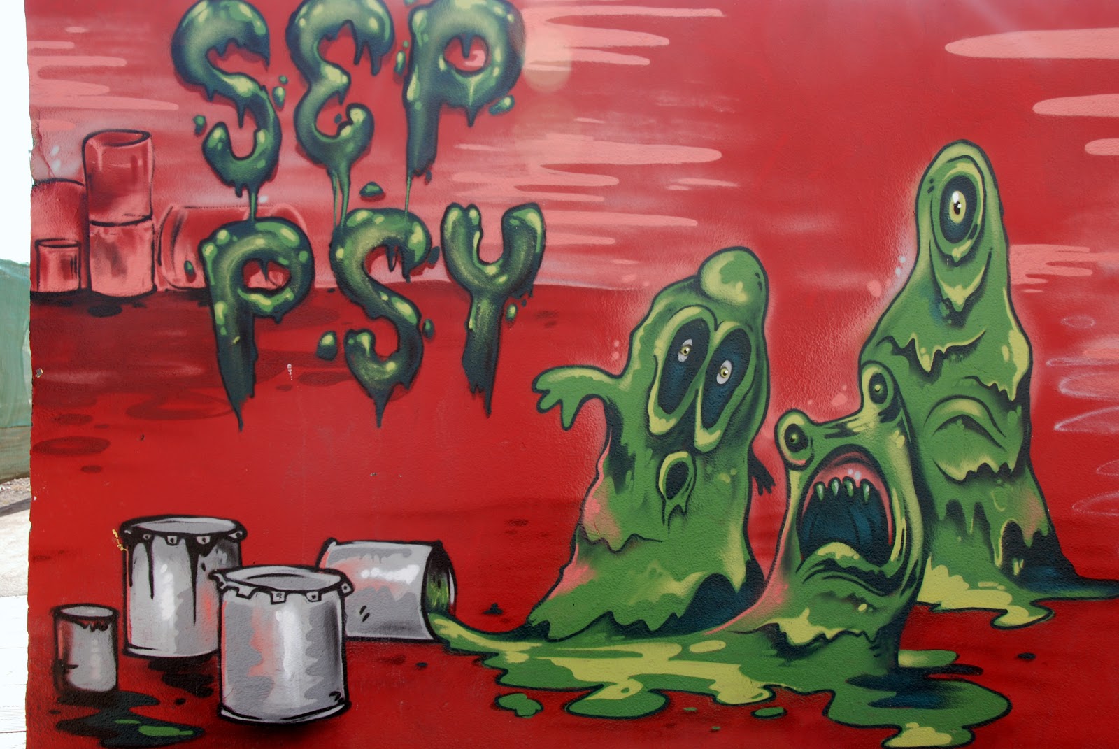 From Santa Cruz - Tenerife we have one of their famous WALL ART Painting, this looks to me as - Green slime paint creatures on a Red background - well its different init lol.